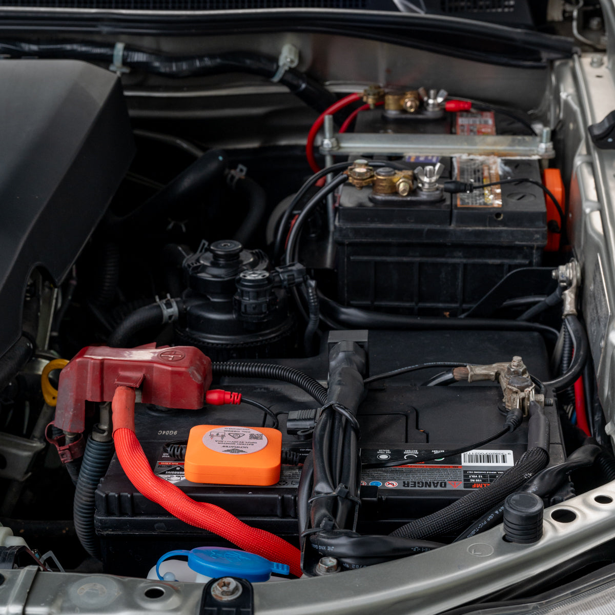 The Bluetooth Battery Monitor can be installed neatly on top of your lithium battery. The 8mm forked cable lugs allow attachment to the battery terminals without having to remove any bolts, just loosen and slide the fork under the nut/bolt and re-tighten. This ensures there is no requirement to disconnect the battery and reset any radio codes etc.