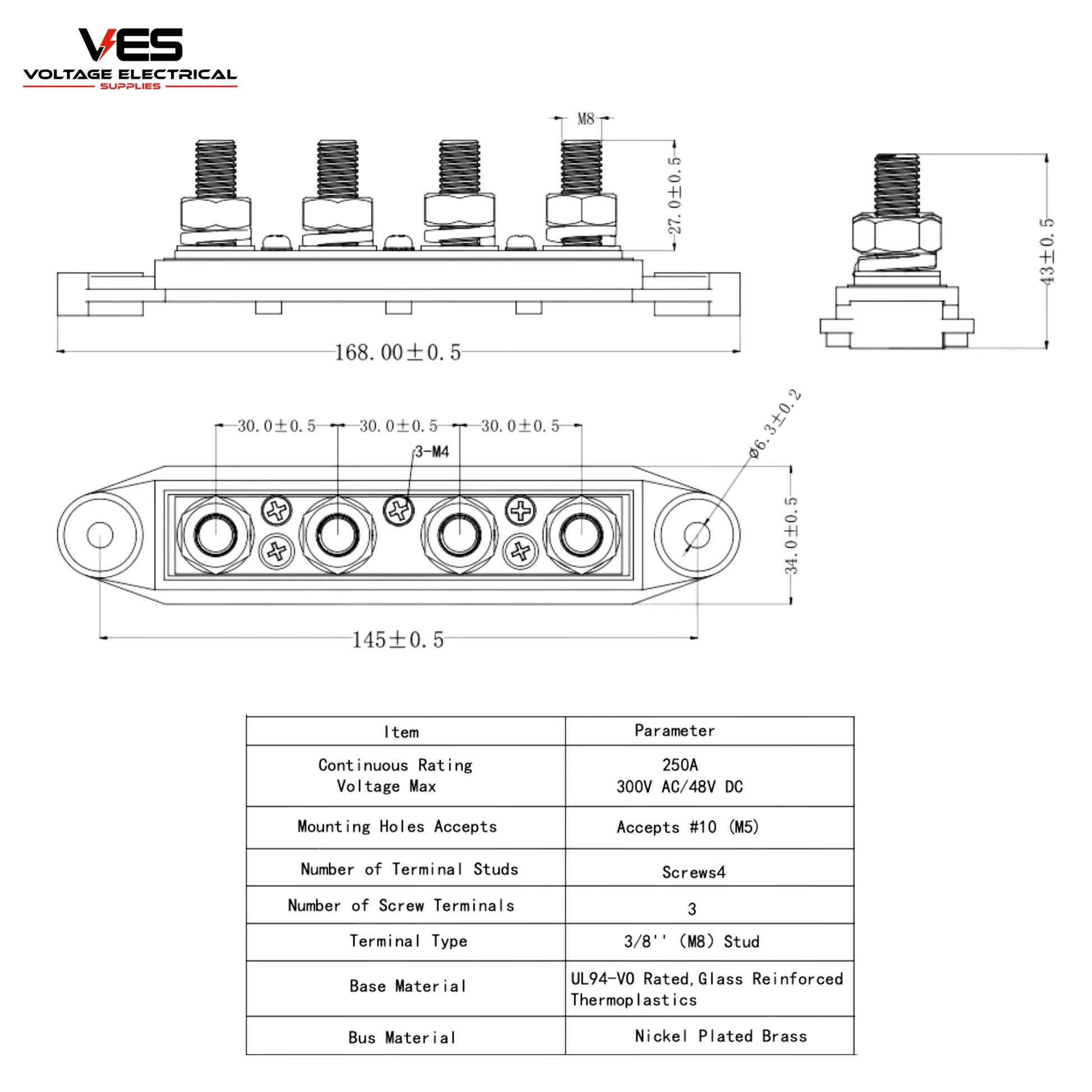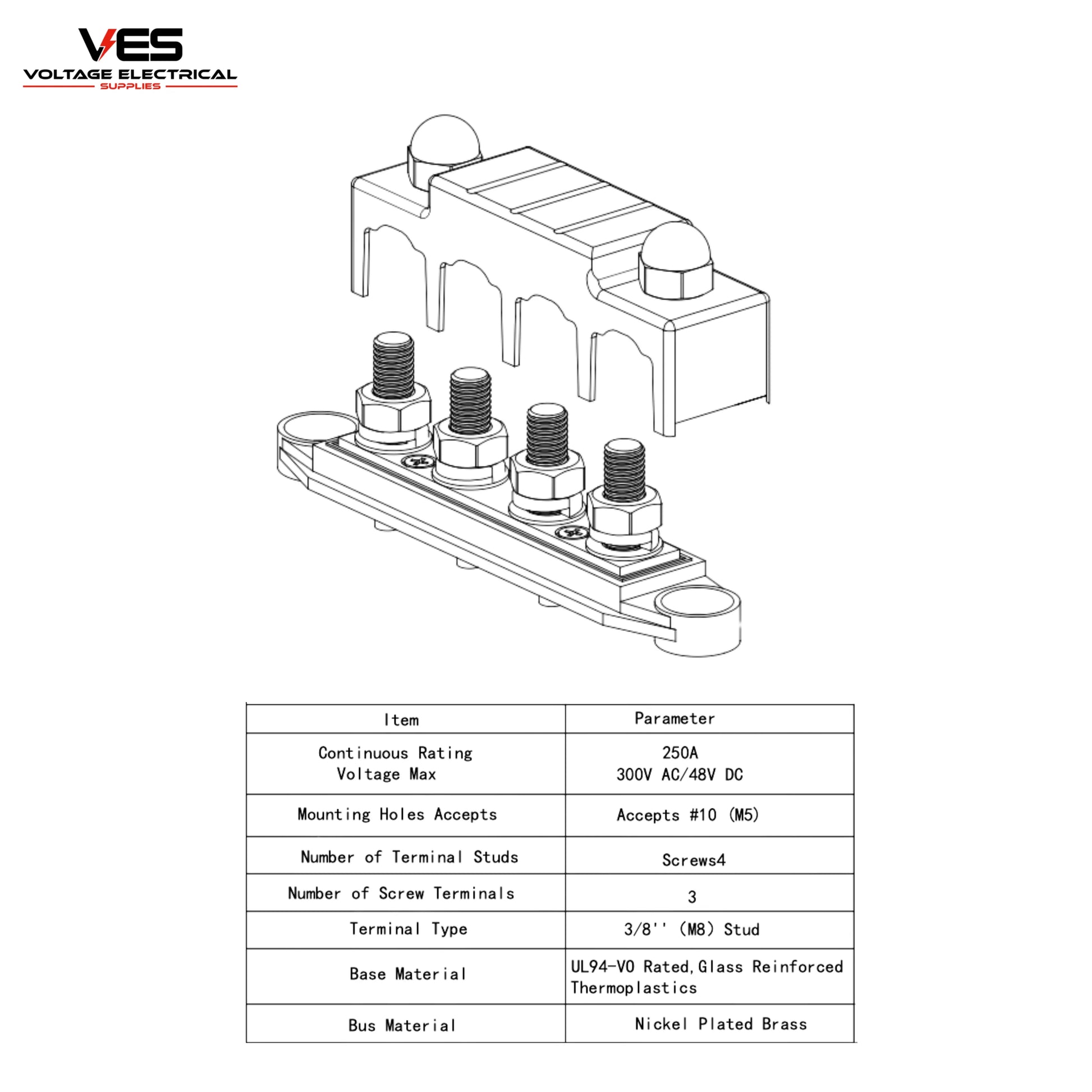 4 Way Distribution Block Positive 8MM Studs 250AMP Rated
