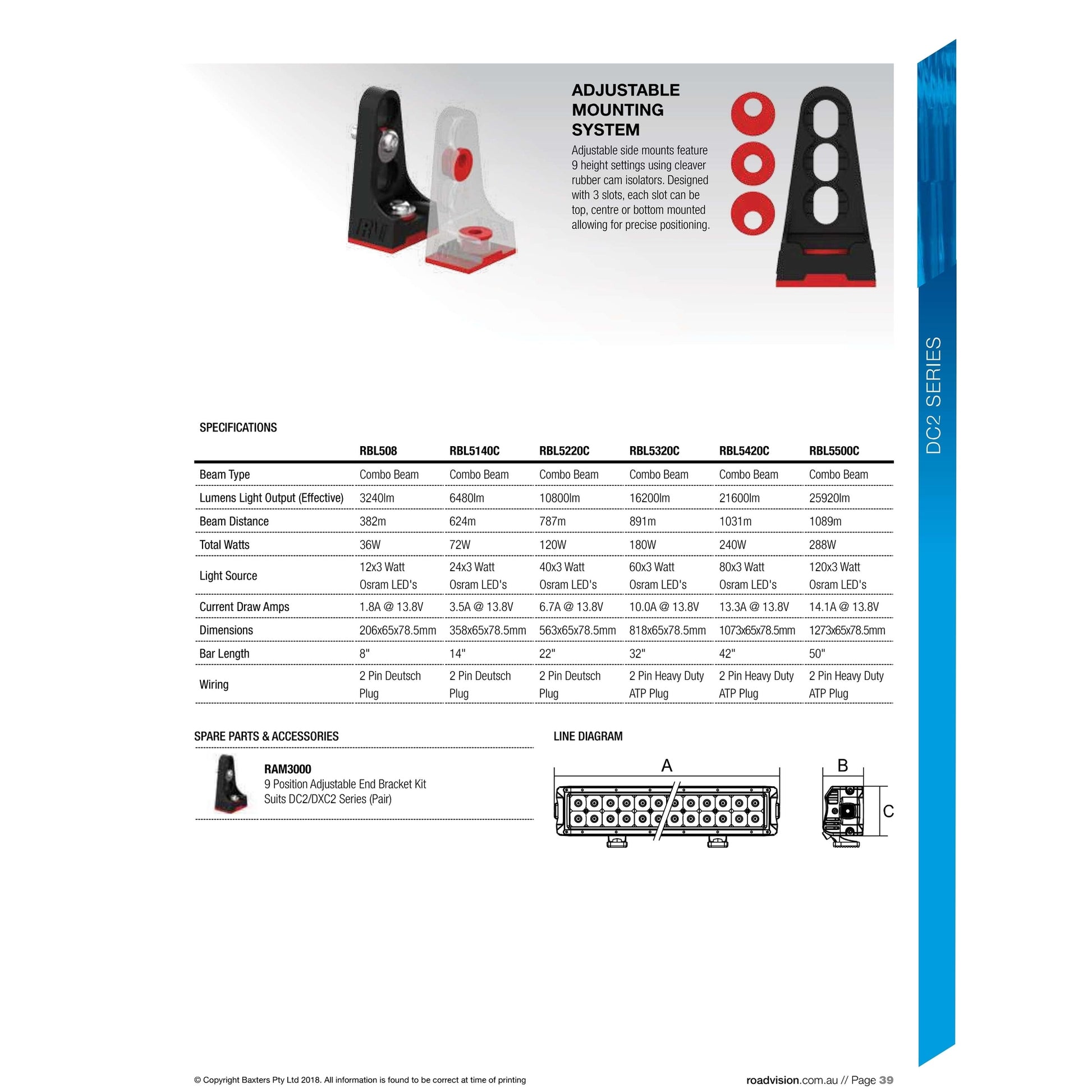 The Roadvision DC2 Series are the next generation in dual row LED light bars. Producing up to a massive 25920lm of light output, the DC2 Series deliver brute power and intense light output with a perfect match of advanced optical design and 3W Osram Hi-Lux LEDs. Featuring the latest soft start, PWM dimming and advanced thermal management technology from Roadvision, the DC2 Series is available in combination beam patterns from 8” to 50” providing a perfect mix of forward penetration and roadside illumination. Supplied with both low profile adjustable slide mounts and Roadvision’s new 9 position adjustable anti-vibration mounting system, the DC2 Series also features a new ultra slim 65mm deep housing providing greater mounting flexibility. The DC2 Series by Roadvision, brute power from the biggest bars in our line-up.