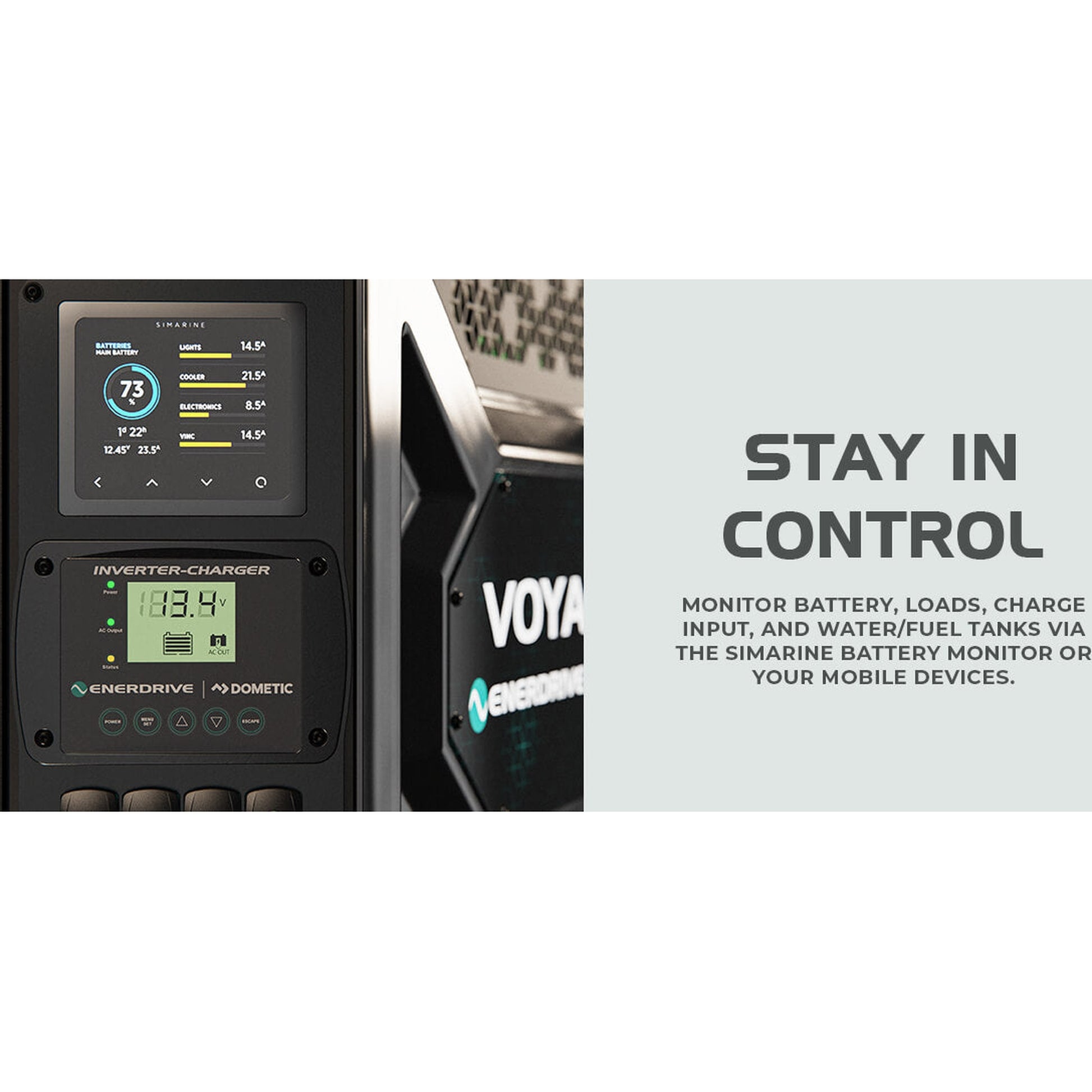 - Monitor battery, loads, charge input, and water/fuel tanks via the Simarine battery monitor or your mobile devices
