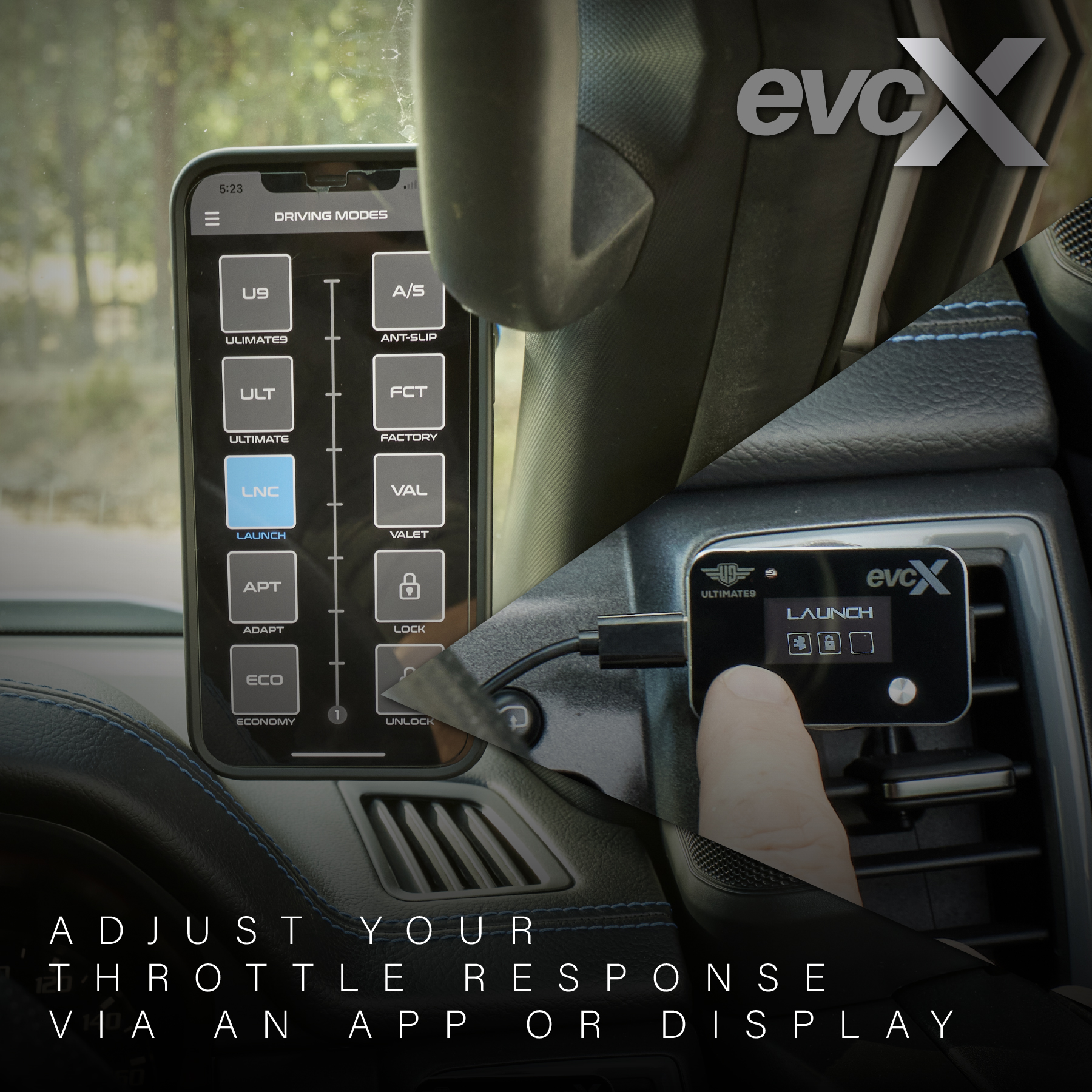 The EVCX is easily installed by the at-home mechanic in less than 15 minutes; simply connect in-line between the factory plug and throttle pedal assembly. The evcX driver interface can be placed on the dash or console of the vehicle.