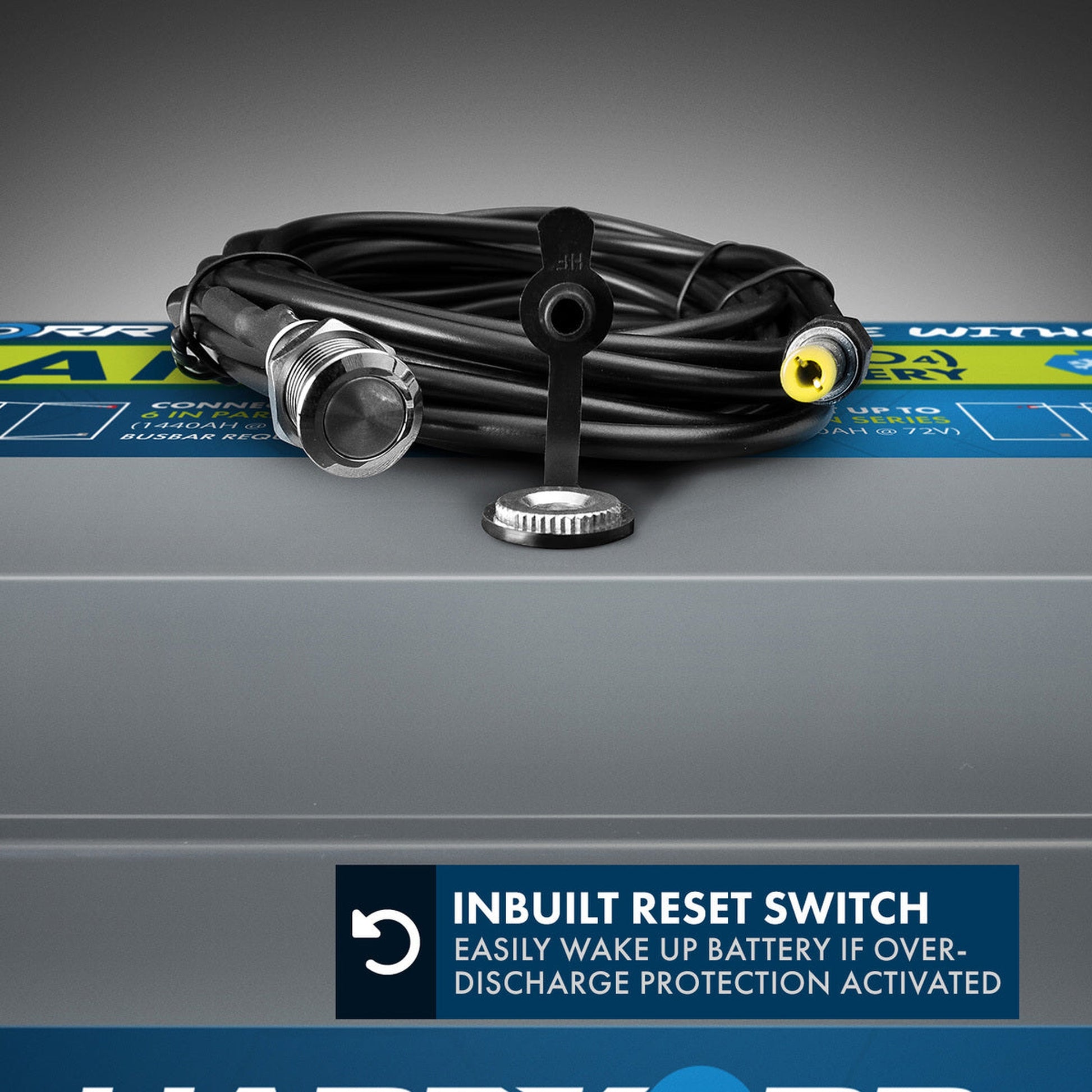 Our batteries provide an easy solution to this problem; simply connect our included remote reset switch to the socket on the top face of the battery and hold down the button for 5 seconds, and the over-discharge circuit will reset itself. The button can also be flush-mounted into your 12v setup if desired.