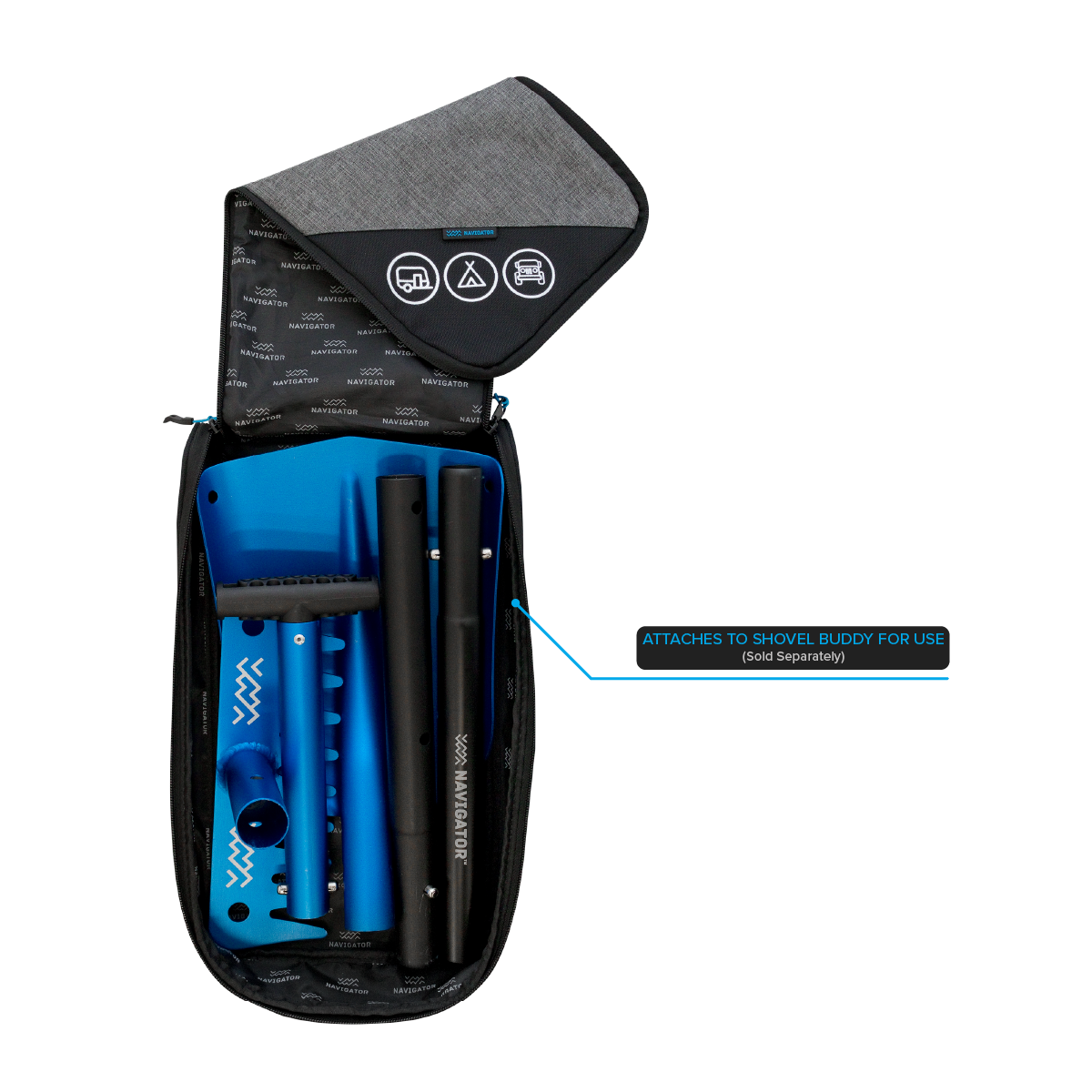 The rake head & extension pole pack away conveniently with the Shovel Buddy into its softshell protective case.