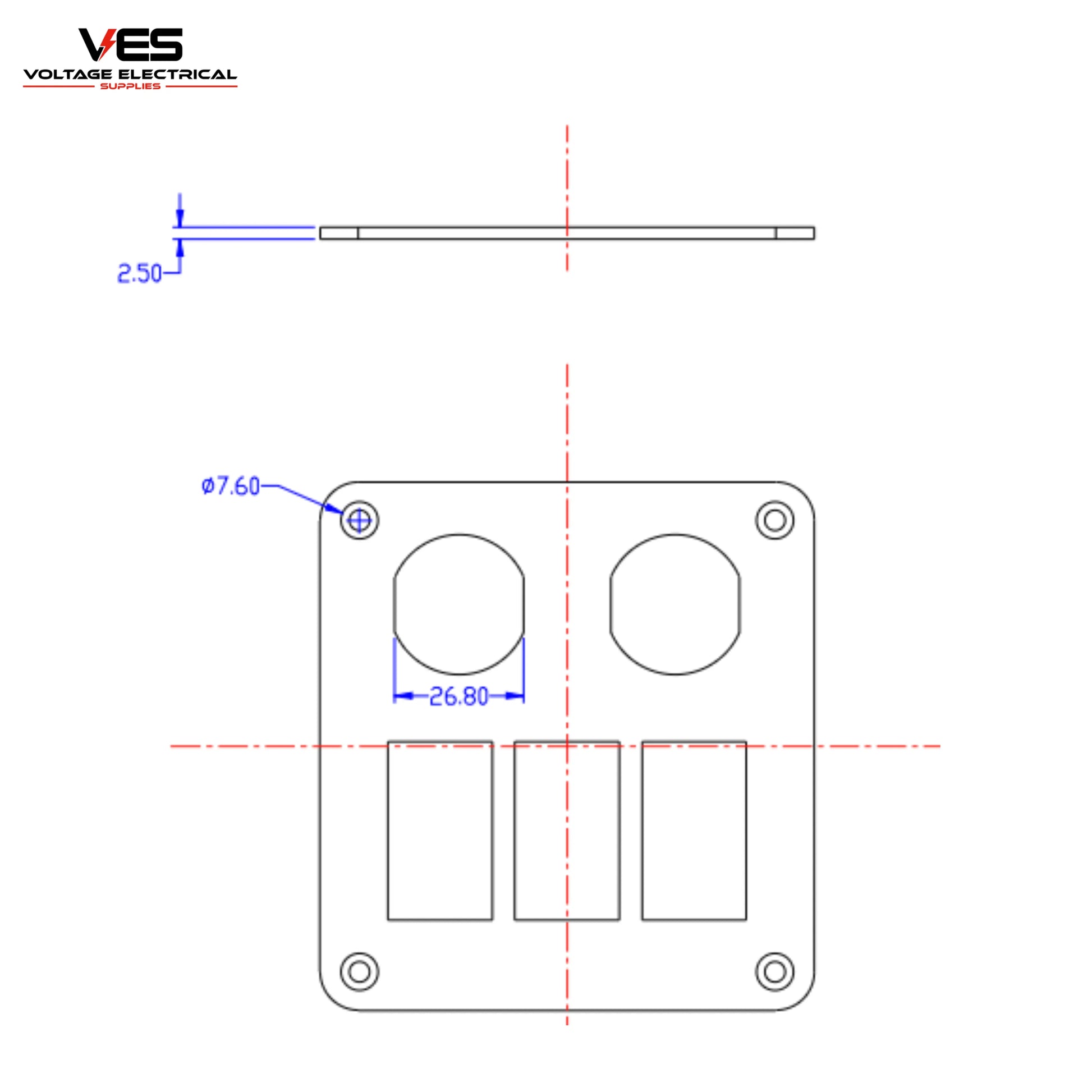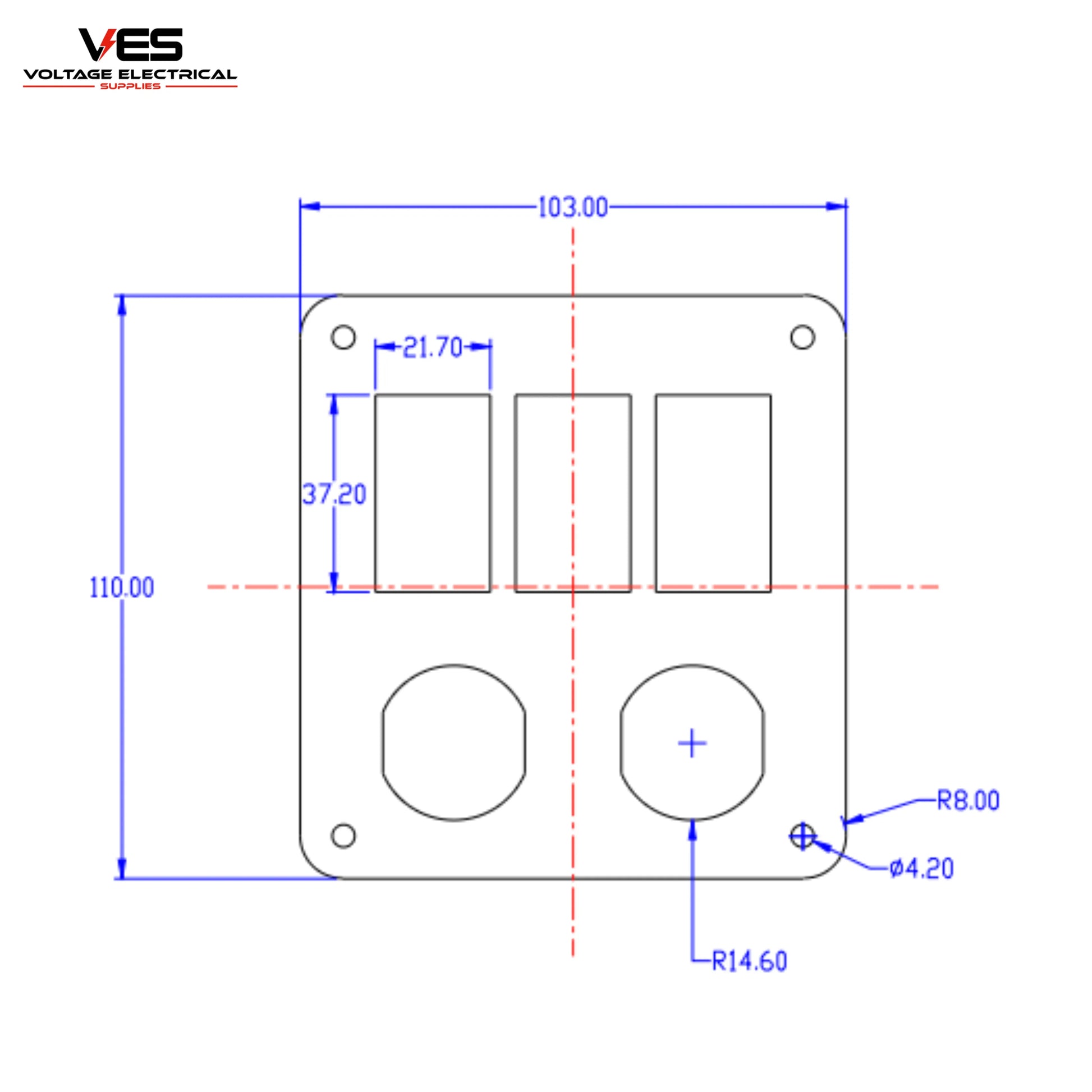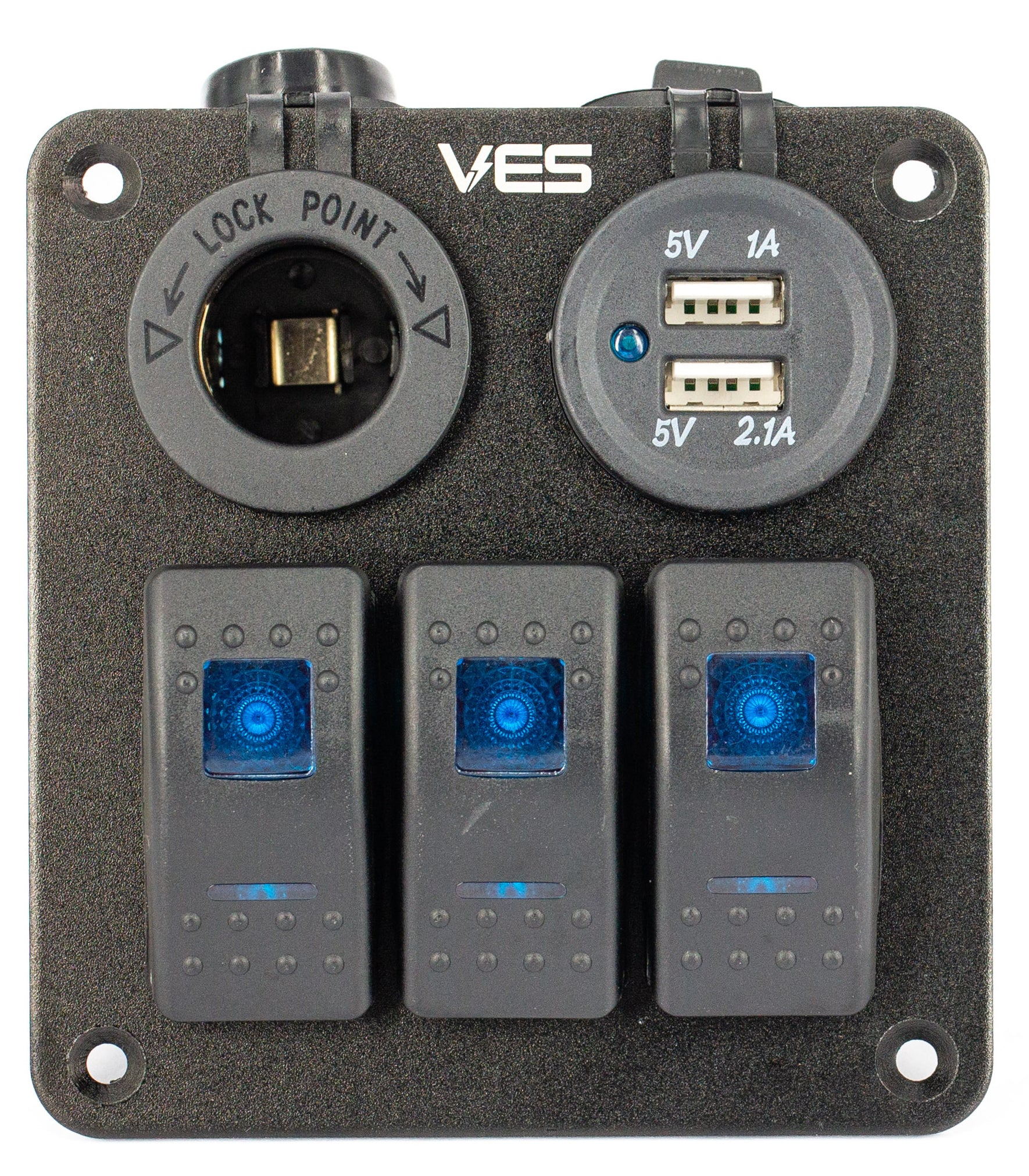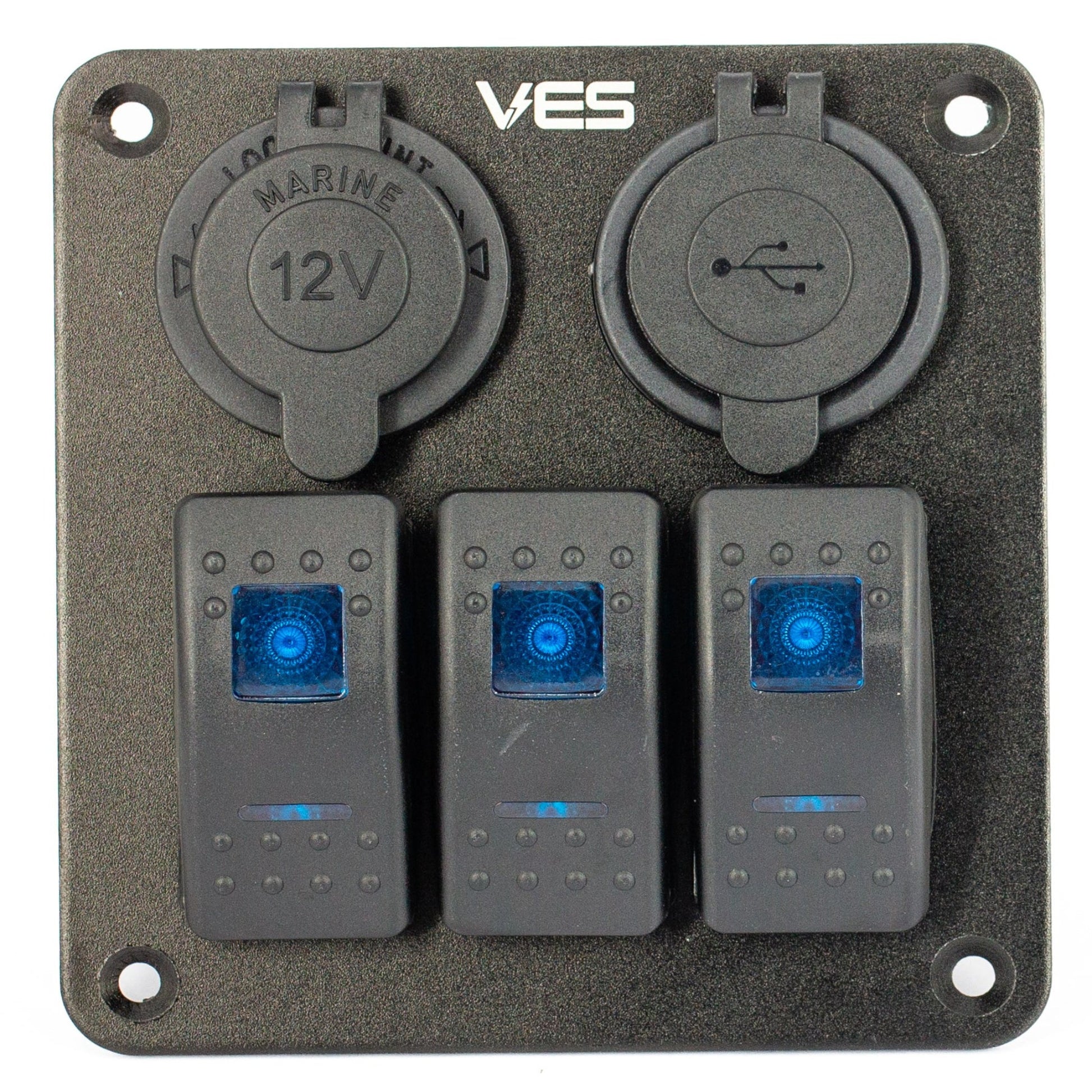 Switch Panel - 3 Blue Rocker Switches + Marine Socket + USB X 2 1amp and 2.4 amp Outlets
