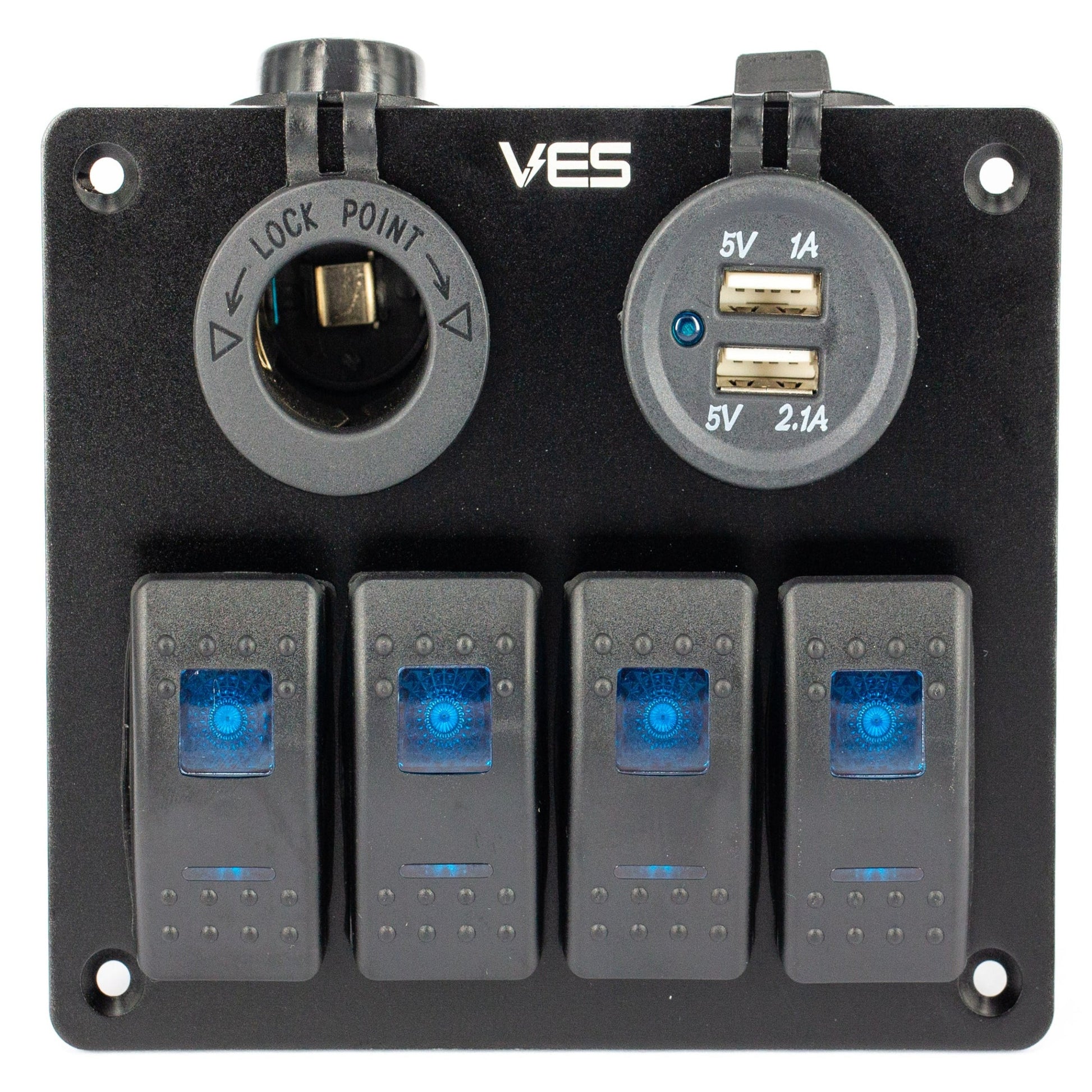 Switch Panel - 4 Blue Rocker Switches + Marine Socket + USB X 2 1amp and 2.4 amp Outlets