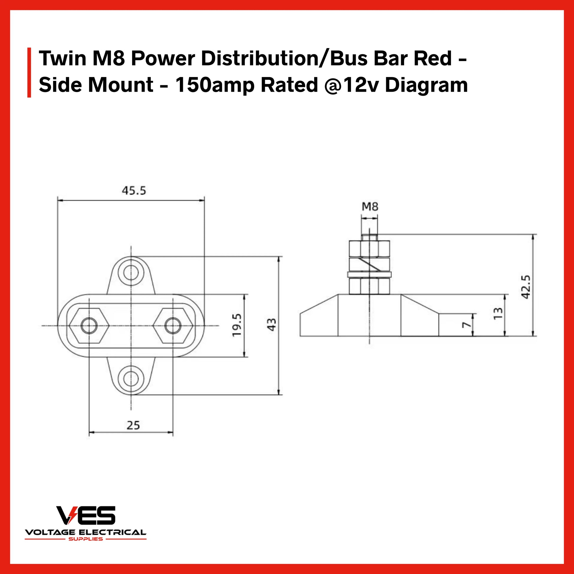 VES Twin M8 Power Distribution Bus Bar – 150A 12V Side Mount