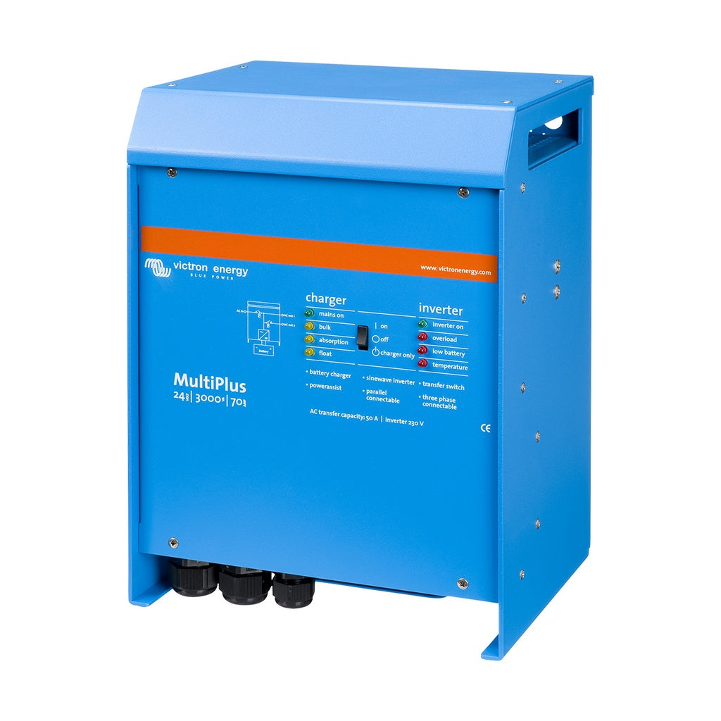 The MultiPlus, as the name suggests, is a combined inverter and charger in one elegant package. Its many features include a true sine wave inverter, adaptive charging, hybrid PowerAssist technology, plus multiple system integration features. The MultiPlus will prevent overload of a limited AC source, such as a generator or shore power connection. First, battery charging will automatically be reduced when otherwise an overload would occur. The second level will boost the output of a generator or shoreside supply with power taken from the battery.